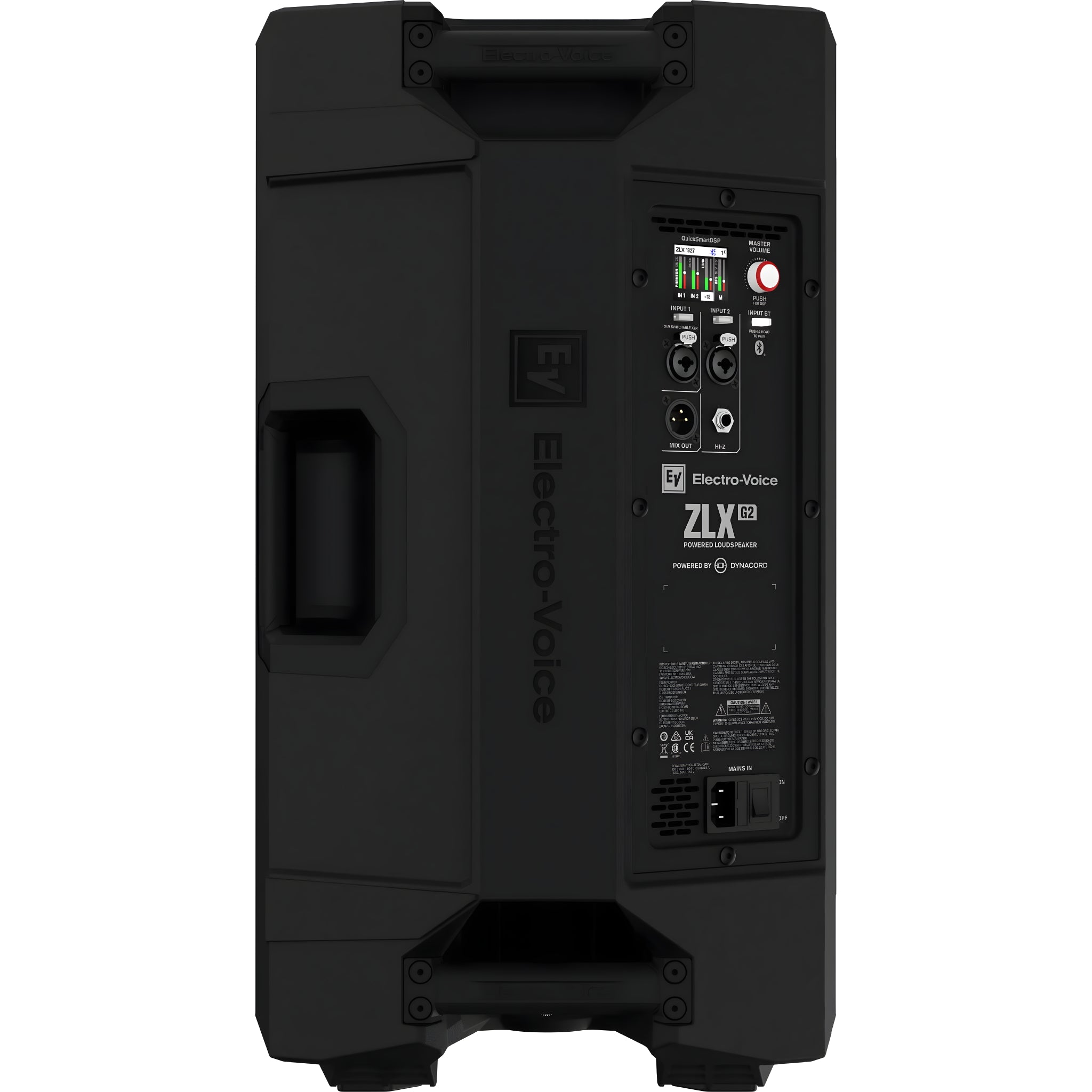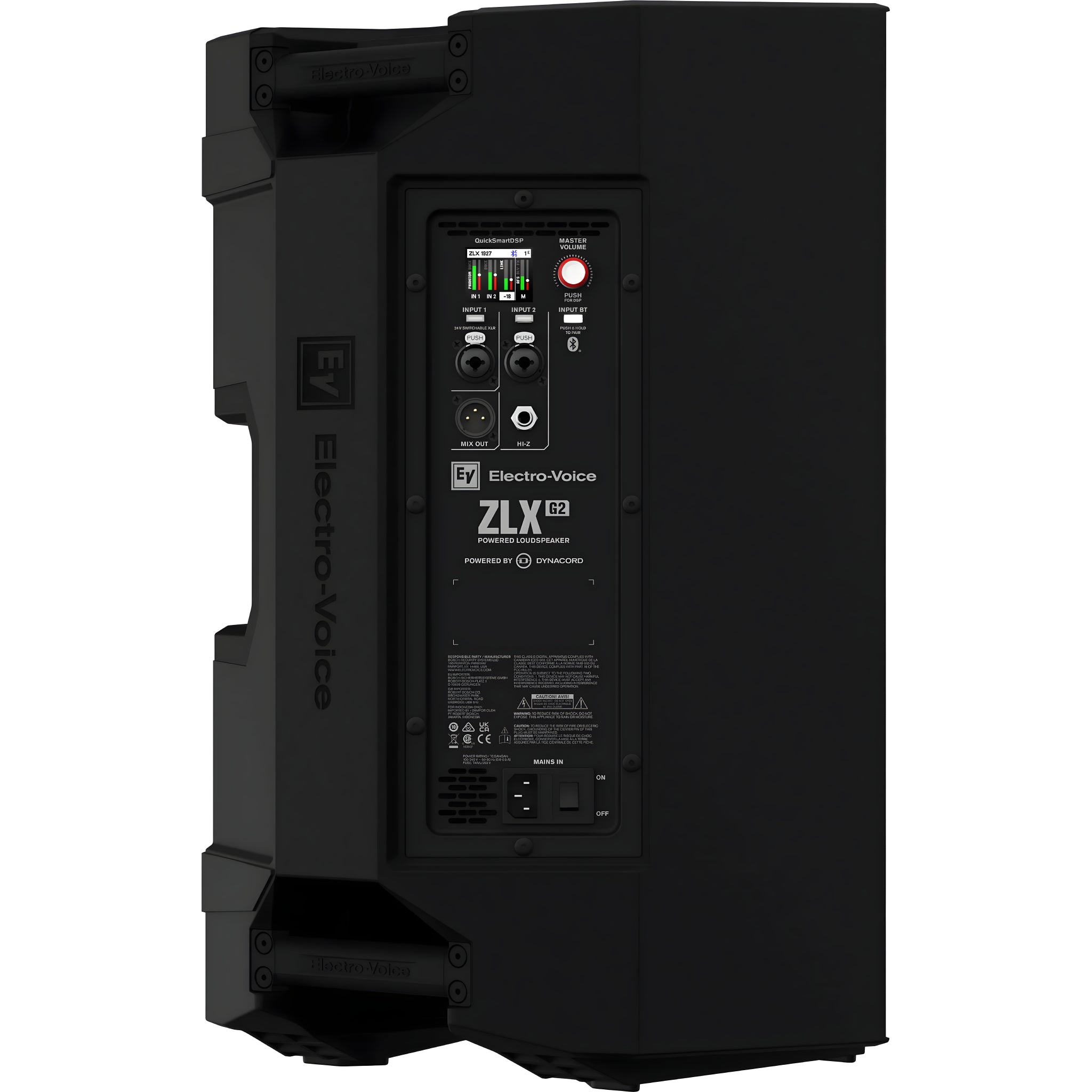El Electro-Voice ZLX-12P-G2 es un sistema full range de 2 vías con amplificación Class-D de 1000 W, diseñado para refuerzo sonoro portátil con alta inteligibilidad y manejo sencillo. Combina un woofer de 12" (WECA2128) con un motor de compresión de 1,4" (DECA2516, diafragma de titanio) detrás de la guía de ondas SST para ofrecer una cobertura controlada de 90° × 60°, graves más firmes y respuesta uniforme. La segunda generación ZLX añade Bluetooth con streaming estéreo y control mediante app QuickSmart Mobile, además de un mezclador digital integrado “Powered by Dynacord” con FX, AFS (supresión automática de realimentación), ducker, PEQ y modos de sistema que incluyen un ajuste FRFR (respuesta plana) para modeladores. El recinto trapezoidal de polipropileno en color negro integra tres asas, copa de 35 mm para trípode/sub y dos ángulos de cuña (55° y 23° kickback) para un uso versátil en escenario.